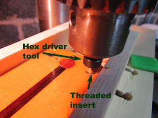 I've tried some different inserts, and this time I went with hex-drive inserts from McMaster-Carr. I sprung for the $7.95 hex driver tool - a good thing. The tool is just a drive you can insert into a drill chuck. I just put everything in place, brought the chuck down, and turned it by hand. It easily threaded right in, nice and square.