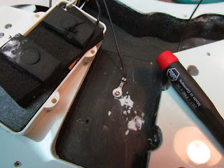 Couple of things here. You can see the famous Jazzmaster pickup height adjustment foam blocks. Not a bad scheme actually. I'll remove these blocks and attach them to my new pickups.