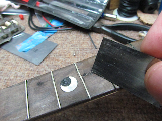 The board is still really dirty - in fact you can see the notorious Green Fingerboard Gunk in the fret slots. So the fills look like they don't quite match, but they'll look perfect when everything is cleaned up.